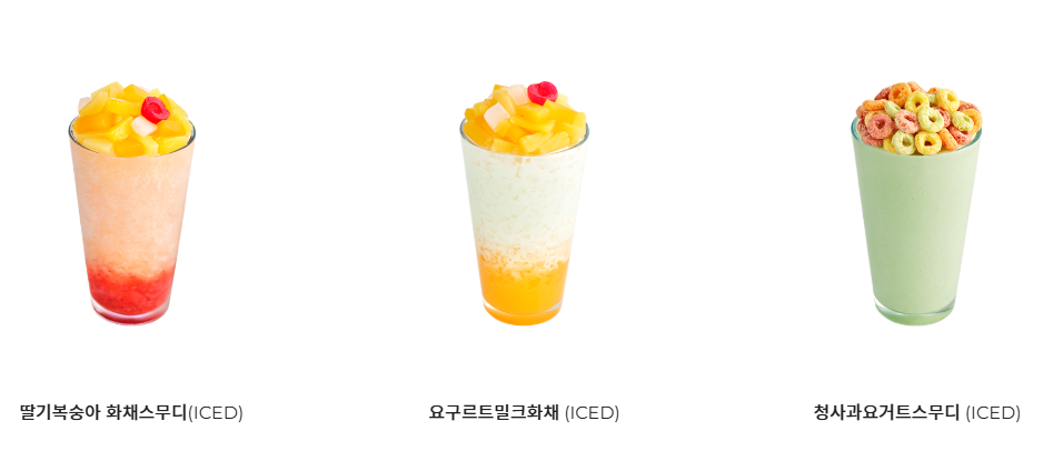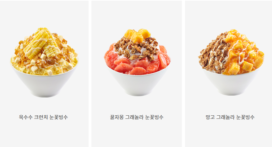 - 팥인절미 / 망고그래놀라 / 꿀자몽 / 초당옥수수 (눈꽃 & 1인 컵빙수)