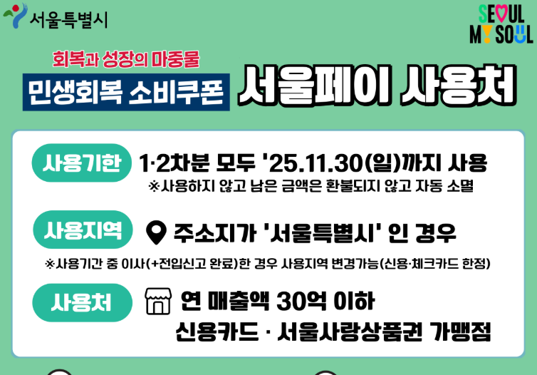 - 신용·체크카드 및 서울사랑상품권 쿠폰: 2025년 11월 30일(일)까지 사용 가능