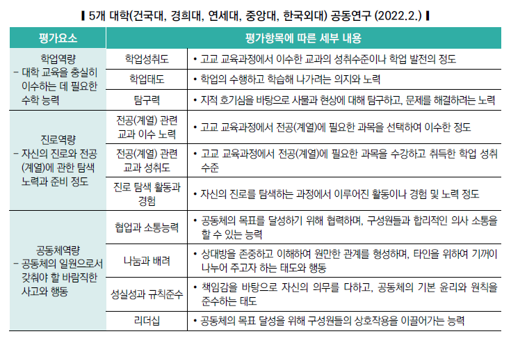 입학사정관이 학업역량, 진로역량, 공동체역량 등을 기준으로 평가합니다.