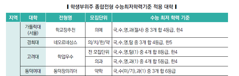 학종은 수능최저학력기준을 적용하지 않는 대학이 많지만, 의약학계열 등 일부 학과는 수능 기준이 매우 높습니다.